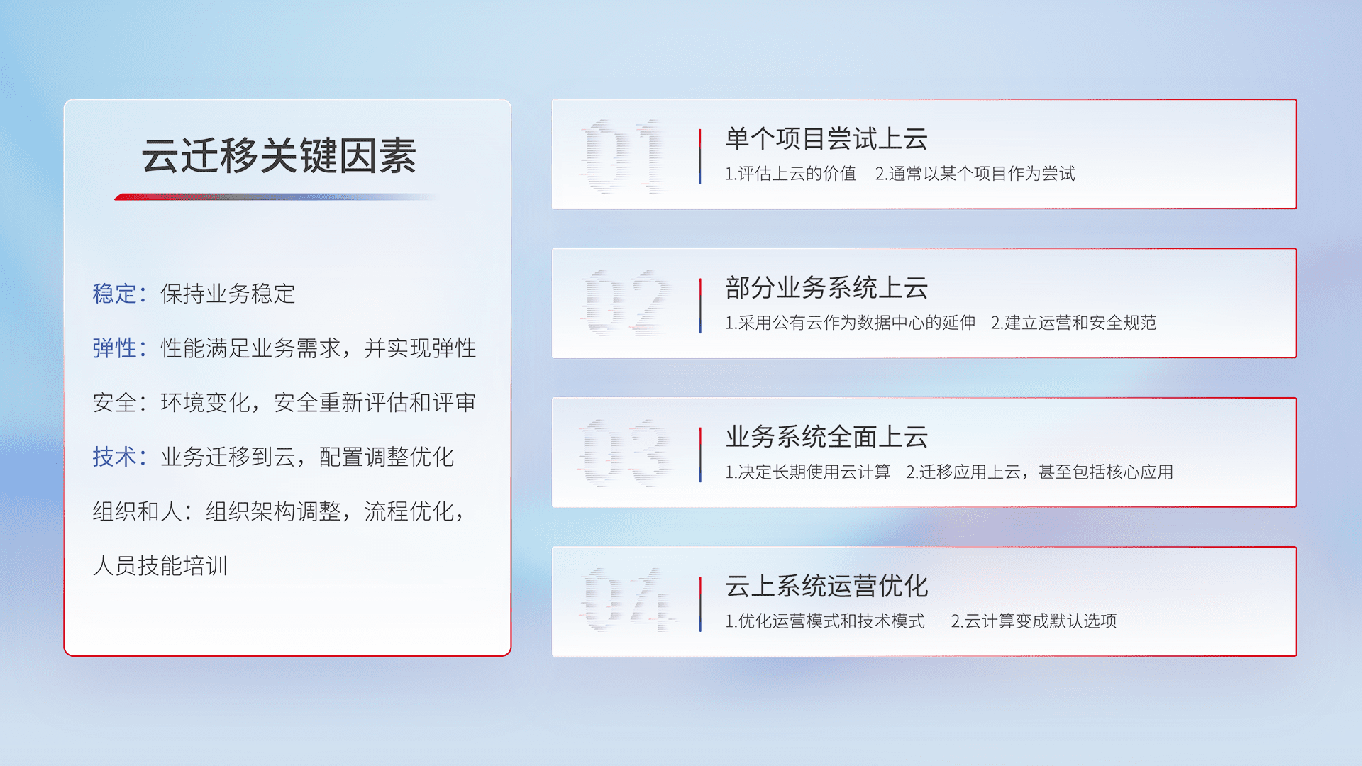 结合实际业务,,,从规划设计、、、、云平台选型、、云原生改造、、数据迁移、、、集成交付,,,迁移全过程为客户识别最佳上云路径,,,,做好风险识别管理,,,,设计网络架构、、身份权限、、安全审计合规、、操作审计、、、日志审计、、、、监控告警策略、、、多站点容灾设计等,,,对云上基础设施进行整体规划,,,,提升IT治理水平,,,以满足弹性、、高可用、、高性能的需求。。。。